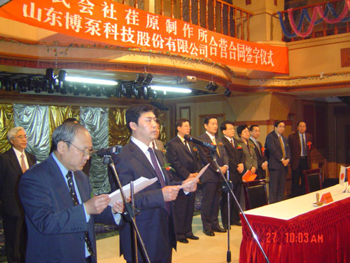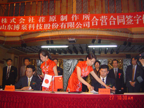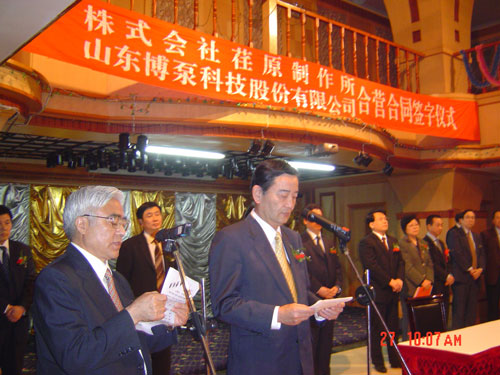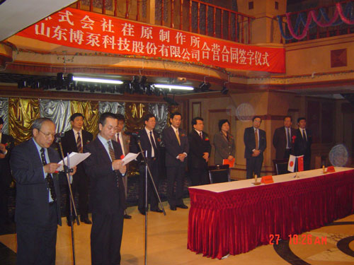新聞中心 2005年4月27日,在博山萬杰國際大酒店山東博泵科技股份有限公司與日本株式會社荏原制作所正式簽署了注冊資本1100萬美元的合營公司――荏原博泵有限責任公司。該公司的建立將通過引進世界最大的泵企業――日本株式會社荏原制作所的先進技術,加快大型泵、高壓泵國產化進程,建成具有國際競爭力的一流企業。為中國水電、核電及超臨界火電項目,為南水北調等大型水力工程提供高質量、高技術含量的一流泵產品,提升中國機械工業技術、質量水平,促進產品更新換代,為中國電力、冶金、水力事業的發展乃至中國國民經濟的發展做出應有的貢獻。