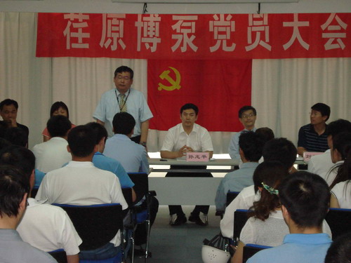 本次黨員大會由黨總支副書記姜作棟同志主持,他首先介紹了黨組織機構的組成:張玉琴同志任黨總支書記,姜作棟同志任黨總支副書記,李正民同志、劉擁民同志、王興春同志分別任統戰委員、組織紀檢委員、文體宣傳委員。荏原博泵黨總支下設管理、生產、質量和業務技術四個黨支部,管理黨支部書記由邱建剛同志擔任,生產黨支部書記由宋遵民同志擔任,質量黨支部書記由郝圣同志擔任,業務技術黨支部書記由梁文運同志擔任。各黨支部通過民主選舉選出了支部委員。在會上,黨總支書記張玉琴同志向全體黨員提出要求,一是加強學習,提高素質;二是增強黨性,努力工作;三是加強領導,發揮作用。著重強調了全體黨員不僅要有較高的政治素質,更要有很強的業務能力和技術水平。要一如既往的發揮黨員的先鋒模范作用,以企業經濟發展為中心任務,身先士卒,帶頭努力干好工作,在營造團結和諧的工作氛圍中發揮作用。公司總經理孫龍平同志在黨員大會上代表行政領導班子作了重要發言,指出目前公司正處在打基礎的關鍵時期,邊建設、邊生產、邊供貨、邊發展。黨組織要充分發揮政治核心作用,領導工會、共青團等群眾組織,團結凝聚廣大員工,貫徹黨的方針政策,促進企業健康發展。