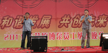 舞蹈《開門紅》寄托著荏原博泵員工對公司發展前景的美好期盼,展示了公司女職工的風采。20多名復員軍人用一首《咱當兵的人》抒發了他們保家衛國、貢獻企業的豪情與壯志;研發部、技術部員工帶來的歌曲《跳起來》,展示了年輕人的青春與活力;質量保證部員工在部長岳東海帶領下,演唱了歌曲《相親相愛一家人》,演繹著荏原博泵大家庭的親情、友情。友情樂隊帶來的動感十足的歌曲,更是將晚會的氣氛烘托到高潮。